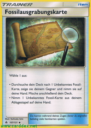 · Durchsuche dein Deck nach 1 Unbekanntes Fossil-Karte, zeige sie deinem Gegner und nimm sie auf deine Hand. Mische anschließend dein Deck.