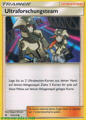 Lege bis zu 2 Ultrabestien-Karten von deiner Hand auf deinen Ablagestapel. Ziehe 3 Karten für jede auf diese Weise auf deinen Ablagestapel gelegte Karte.