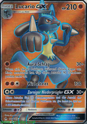 Kosten: Wenn sich dieses Pokémon während dieses Zuges aus Riolu entwickelt hat, fügt diese Attacke 90 Schadenspunkte mehr zu.  Schaden:
