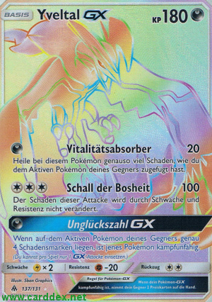 Wenn auf dem Aktiven Pokémon deines Gegners genau 4 Schadensmarken liegen, ist jenes Pokémon kampfunfähig. (Du kannst pro Spiel nur 1 GX-Attacke einsetzen.)