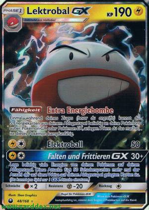 Lege beliebig viele Energien von deinen Pokémon auf deinen Ablagestapel. Diese Attacke fügt 50 Schadenspunkte mehr mal der Anzahl der auf diese Weise auf deinen Ablagestapel gelegten Karten zu. (Du kannst pro Spiel nur 1 GX-Attacke einsetzen.)