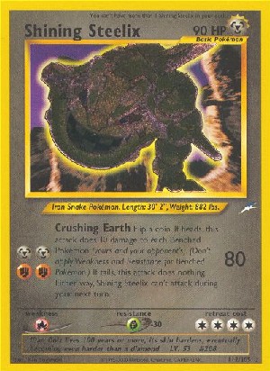 Wirf eine Münze. Bei "Kopf" fügt dieser Angriff allen Pokémon auf der Bank 10 Schadenspunkte zu (deinen und denen deines Gegners). (Wende Schwäche und Resistenz bei Pokémon auf der Bank nicht an.) Bei "Zahl" hat dieser Angriff keine Auswirkungen. Unabhängig davon, kann Schimmerndes Stahlos während deines nächsten Zuges nicht angreifen.