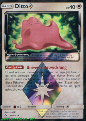 Einmal während deines Zuges (bevor du angreifst) kannst du eine beliebige Phase-1-Karte aus deiner Hand auf dieses Pokémon legen, um es zu entwickeln. Du kannst diese Fähigkeit nicht während deines ersten Zuges oder während des Zuges, in dem dieses Pokémon ins Spiel gebracht wurde, einsetzen.