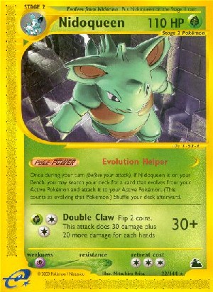 Einmal während deines Zuges (vor deinem Angriff) kannst du, falls Nidoqueen auf deiner Bank ist, dein Deck nach einer Karte durchsuchen, die sich aus deinem aktiven Pokémon entwickelt, und sie an dein aktives Pokémon anlegen. (Dies zählt als Entwickeln dieses Pokémon.) Mische dein Deck danach.