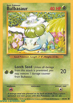 Kosten: Falls das verteidigende Pokemon den Schaden dieses Angriffs nicht abwehren kann, kannst du eine Schadensmarke von Bisasam entfernen.  Schaden: