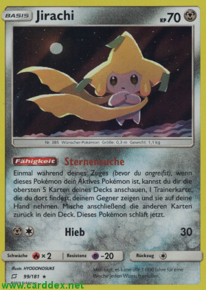 Einmal während deines Zuges (bevor du angreifst), wenn dieses Pokémon dein Aktives Pokémon ist, kannst du dir die obersten 5 Karten deines Decks anschauen, 1 Trainerkarte, die du dort findest, deinem Gegner zeihen und sie auf deine Hand nehmen. Mische anschließend die anderen Karten zurück in dein Deck. Dieses Pokémon schläft jetzt.