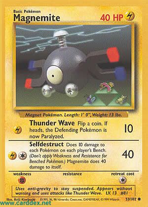 Kosten: Fügt jedem Pokemon auf der Bank eines jeden Spielers 10 Schadenspunkte zu. (Schwäche und resistenz für Pokemon auf der Bank nicht anwenden!) Magnetilo fügt isch selbst 40 Schadenspunkte zu.  Schaden:
