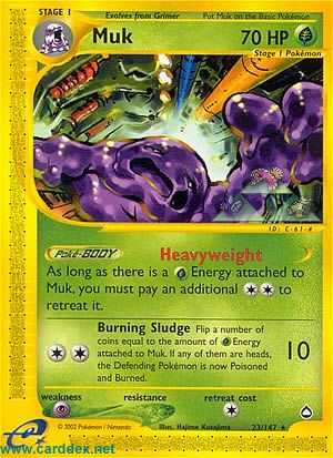 Kosten: Wirf so viele Münzen, wie -Energie an Sleimok angelegt ist. Falls mindestens eine von ihnen "Kopf" zeigt, ist das Verteidigende Pokémon jetzt vergiftet und verbrannt.  Schaden: