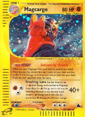 Wenn du Magcargo aus deiner Hand spielst, um dein aktives Pokémon zu entwickeln, kannst du die obersten 3 Karten deines Decks auf deinen Ablagestapel legen und dann 3 Basis-Energiekarten aus deinem Ablagestapel in dein Deck mischen. Falls du dies tust, tut es dein Gegner ebenfalls.