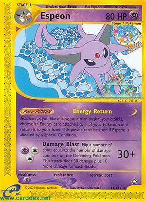 As often as you like during your turn (before your attack), choose an Energy card attached to 1 of your Pokemon and return it to your hand. This power can't be used if Espeon is affected by a Special Condition.
