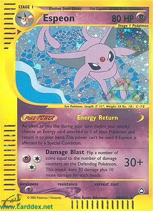 As often as you like during your turn (before your attack), choose an Energy card attached to 1 of your Pokemon and return it to your hand. This power can't be used if Espeon is affected by a Special Condition.
