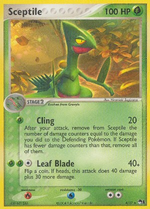 After your attack, remove from Sceptile the number of damage counters equal to the damage you do to the Defending Pokemon. If Sceptile has fewer damager counters than that remove all of them.