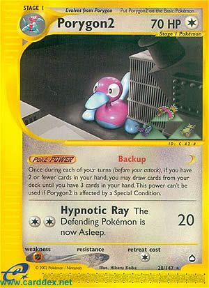 Einmal während deines Zuges (vor deinem Angriff) kannst du, wenn du 2 oder weniger Karten auf deiner Hand hast, so viele Karten von deinem Deck ziehen, bis du 3 Karten auf deiner Hand hast. Diese Fähigkeit kann nicht verwendet werden, falls Porygon2 von einem Speziellen Zustand betroffen ist.