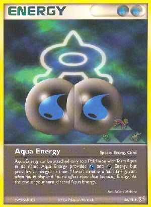 Beschreibung: Aqua Energy can be attached only to a Pokemon with Team Aqua in its name. Aqua Energy provides and /or Energy but provied 2 Energy at a time. (Doesn't count as a basci Energy card wehn not in play and has no effect other than providing Energy.) At the end of your turn, discard Aqua Energy.