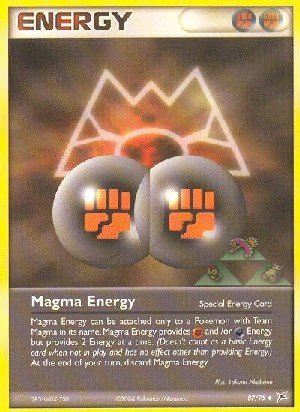 Beschreibung: Magma Energy can be attached only to a Pokemon with Team Magma in its name. Magma Energy provides and /or Energy but provied 2 Energy at a time. (Doesn't count as a basci Energy card wehn not in play and has no effect other than providing Energy.) At the end of your turn, discard Magma Energy.
