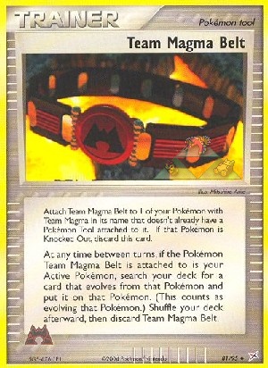 Zu jedem Zeitpunkt zwischen den Zügen darfst du, falls das mit Team Magma Gürtel ausgerüstete Pokémon dein aktives Pokémon ist, darfst du eine Karte aus deinem Deck suchen, die sich aus dieser Karte entwickelt und lege sie auf das Pokémon. (Dies zählt als entwickeln des Pokémons.) Mische dein Deck danach, dann lege Team Magma Gürtel ab. |