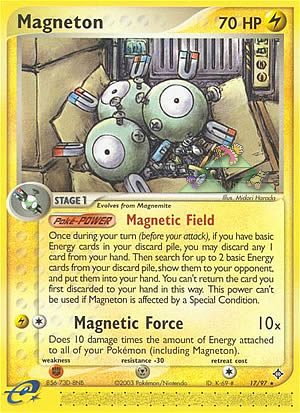 Einmal während deines Zuges (vor deinem Angriff), wenn mindestens 1 Basis-Energiekarte auf deinem Ablagestapel liegt, kannst du 1 Karte von deiner Hand auf den Ablagestapel legen. Wenn du das machst, durchsuche deinen Ablagestapel nach bis zu 2 Basis-Energiekarten, zeige sie deinem Gegner und nimm sie auf deine Hand. Du kannst auf diese Weise nicht die gerade abgelegte Karte auf die Hand nehmen. Diese Poké-Power kann nicht verwendet werden, falls Magneton von einem Speziellen Zustand betroffen ist.