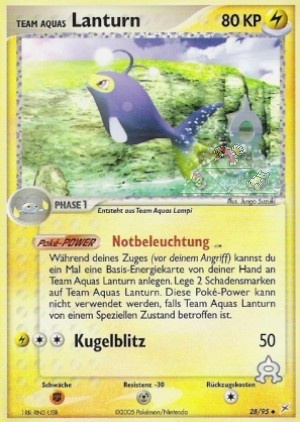 Once during your turn (before your attack), you may attach a basic Energy card from your hand to Team Aqua's Lanturn. Put 2 damage counters on Team Aqua's Lanturn. This power can't be used if Team Aqua's Lanturn is affected by a Special Condition.