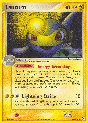 Once during your opponent's turn, when any of your Pokémon is Knocked Out by your opponent's attacks, you may use this power. Choose a basic Energy card discarded from the Knocked Out Pokémon and attach it to Lanturn. You can't use more than 1 Energy Grounding Poké-Power each turn.