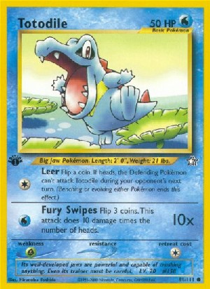 Kosten: Flip a coin. If heads, the Defending Pokémon can't attack Totodile during your opponent's next turn. (Benching or evolving either Pokémon ends this effect.)  Schaden:
