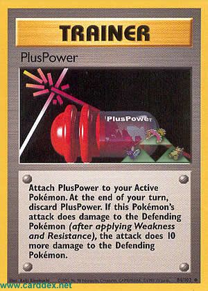 Beschreibung: Lege PlusPower auf Deinem aktiven Pokemon ab, und entferne die Karte am Ende Deines Zugs iweder. Fügt deine Attacke dem verteidigenden Pokemon Schaden zu (nachdem Schwäche und Resistenz abgerechnet wurden), so erleidet das verteidigende Pokemon 10 weitere Schadenspunkte.
