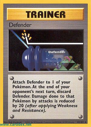 Beschreibung: Lege Defender auf einem Deiner Pokemon ab, und entferne die Karte nach dem nächsten gegenerischen Angriff wieder. Der Deinem Pokemon zugefühgte Schaden wird um 20 Schadenspunkte reduziert (nachdem Schäwche und Resistenz abgerechnet wurden).