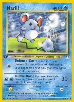 Kosten: Flip a coin. If heads, the Defending Pokémon is now Paralyzed. If tails, Marill does 10 damage to itself.  Schaden: