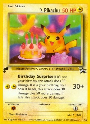 Kosten: If it's not your birthday, this attack does 30 damage. If it is your birthday, flip a coin. If heads, this attack does 30 damage plus 50 more damage; if tails, this attack does 30 damage.  Schaden: