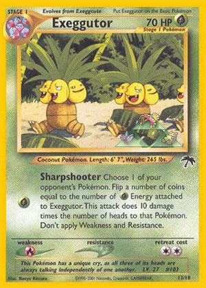 Choose 1 of your opponent's Pokemon. Flip a coin equal to the number of Energy attached to Exeggutor. This attack does 10 damage times the number of heads to that Pokemon. Don't apply Weakness and Resistance.