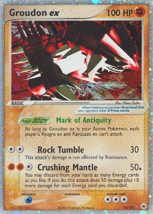As long as Groudon ex is your Active Pokémon, each player's Kyogre ex and Rayquaza ex can't attack.