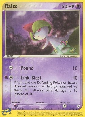 Kosten: If Ralts and the Defending Pokémon have a different amount of Energy attached to them, this attack's base damage is 10 instead of 40.  Schaden: