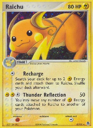 Kosten: Du kannst beliebig viele an Raichu angelegte - Energiekarten an ein anderes deiner Pokemon anlegen.  Schaden: