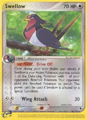 Einmal in deinem Zug (vor deinem Angriff), wenn Schwalboss dein Aktives Pokémon ist, kannst du 1 Verteidigendes Pokémon mit einem gegnerischen Pokémon (dieses wählt dein Gegner aus) auf der Bank austauschen. Diese Poké-Power kann nicht verwendet werden, falls Schwalboss von einem Speziellen Zustand betroffen ist.