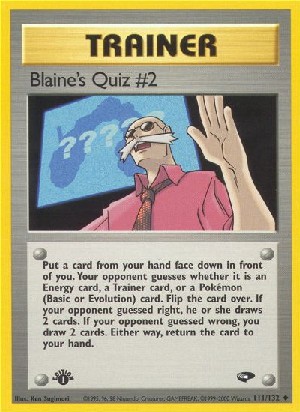 Beschreibung: Put a card from your hand face down in front of you. Your opponent guesses whether it is an Energy card, a Trainer card, or a Pokemon (Basis or Evolution) card. Flip the card over. If your opponent guessed right, he or she drwas 2 cards. If your opponent guessed wrong, you draw 2 cards. Either way, return the card to your hand.