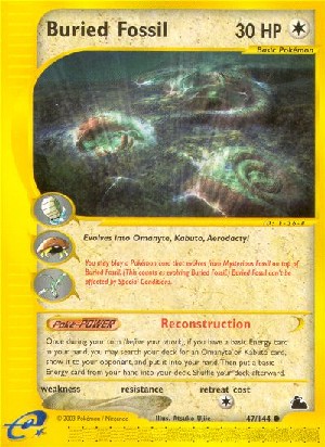 Einmal während deines Zuges (vor deinem Angriff) kannst du, falls du eine Basis-Energiekarte auf deiner Hand hast, dein Deck nach einer Amonitas oder Kabuto-Karte durchsuchen, sie deinem Gegner zeigen und auf deine Hand nehmen. Lege dann eine Basis-Energiekarte aus deiner hand in dein Deck. Mische dein Deck danach.