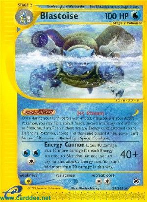 Once during your turn (before you attack), if Blastoise is your Active Pokémon, you may flip a coin. If heads, discard an Energy card attached to Blastoise. Then, if there any Energy cards attached to the Defending Pokémon, choose 1 of them and discard it. This power can't be used if Blaistoise is affected by a Special Condition.