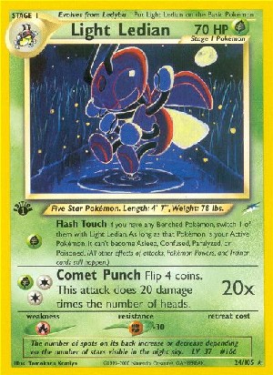 Falls du mindestens ein Pokémon auf deiner Bank hast, tausche eines von diesen mit Helles Ledian. Solange dieses Pokémon dein Aktives Pokémon ist, kann es nicht schlafen, verwirrt, gelähmt oder vergiftet sein. (Alle anderen Effekte von Angriffen, Pokémon-Powers und Trainerkarten finden immer noch statt.)