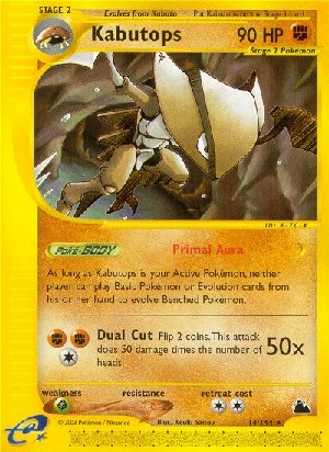 Solange Kabutops dein aktives Pokemon ist, kann keiner der Spieler Basis- Pokemon oder Entwicklungskarten aus seiner Hand spielen, um Pokemon auf seiner Bank zu entwickeln.