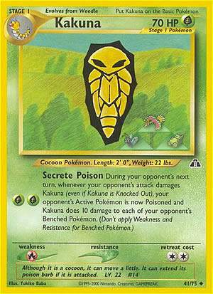 Immer wenn während des nächsten Zugs deines gegners der Angriff deines gegners Kokuna Schaden zufügt (selbst wenn Kokuna kampfunfähig ist), ist das verteidigende Pokemon deines Gegners dann vergiftet und Kokuna fügt jedem Pokemon auf der Bank deines Gegners 10 Schadenspunkte zu. (Wende Schwäche und Resistenz bei Pokemon auf der Bank nicht an.)