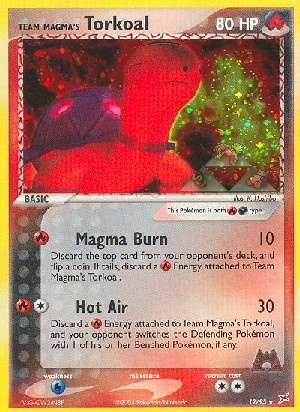 Kosten: Discard a Energy attached to Team Magma's Torkoal, and your opponent switches the Defending Pokémon with 1 of his or her Benched Pokémon, if any.  Schaden: