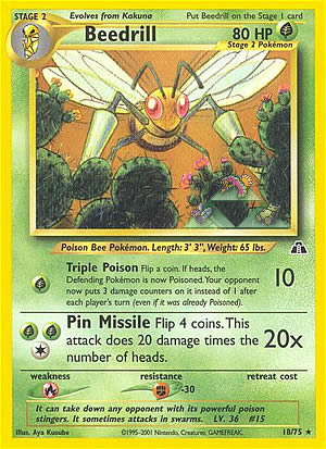 Kosten: Wirf eine Münze. Bei "Kopf" ist das verteidigende Pokemon jetzt vergiftet. Dein gegner legt jetzt nach dem Zug jedes Spielers drei Schadensmarken (statt einer) auf es (selbst wenn es vorher bereits vergiftet war).  Schaden:
