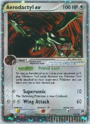 Solange sich Aerodactyl ex im Spiel befindet, kann dein Gegner keine Pokémon-Ausrüstungs-Karten spielen. Entferne alle Pokémon-Ausrüstungs-Karten, die an den gegnerischen Pokémon angelegt sind und lege sie auf seinen Ablagestapel.