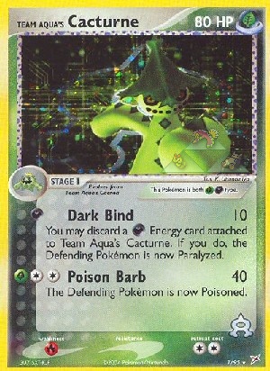 Kosten: You may discard a Energy card attached to Team Aqua's Cacturne. If you do, the Defending Pokémon is now Paralyzed.  Schaden: