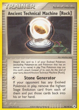 Beschreibung: Attach this card to 1 of your Evolved Pokémon (excluding Pokémon-ex and Pokémon that has an owner in its name) in play. That Pokémon may use this card's attack instead of its own. At the end of your turn, discard Ancient Technical Machine [Rock].