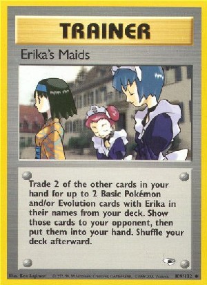 Beschreibung: Trade 2 of the other cards in your hand for up to 2 Basic Pokemon and/or Evolution cards with Erika in their names from your deck.Show those cards to your opponent, then put them into your hand. Shuffle your deck afterward.