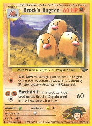 Kosten: All damage done to Brock´s Dugtrio during your opponent´s next turn is reduced by 20 (after applying Weakness and Resistance).  Schaden: