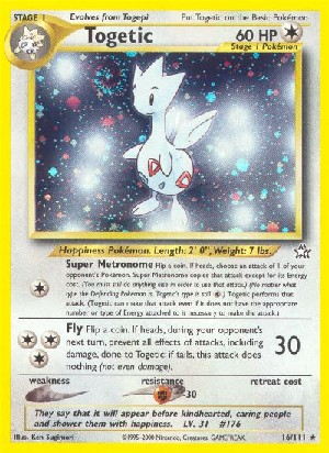 Wirf eine Münze. Wähle bei 'Kopf' einen der Angriffe eines der gegnerischen Pokemon. Supermetronom kopiert diesen Angriff außer den Energiekosten. (Du musst allerdings alles andere tun, um diesen Angriff zu verwenden.) (Unabhängig vom Typ des verteidigenden Pokemon ist Togetics Typ immer noch .) Togetic führt diesen Angriff aus. (Togetic kann diesen Angriff ausführen, selbst wenn nicht die entsprechende Anzahl und Sorte Energiekarten daran angelegt sind, die nötig wären, um diesen Angriff auszuführen.) |