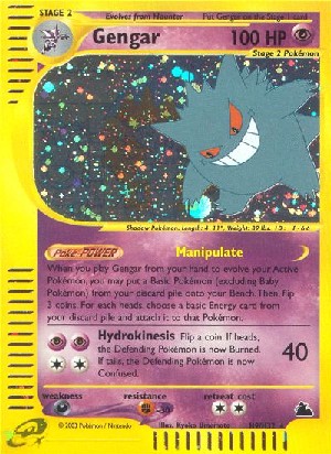 Wenn du Gengar aus deiner Hand spielst, um dein aktives Pokemon zu entwickeln, kannst du ein Basis-Pokemon (aber kein Baby-Pokemon) aus deinem Ablagestapel nehmen und auf deine Bank legen. Wirf dann 3 Münzen. Wähle für jeden geworfenen 'Kopf' eine Basis-Energiekarte aus deinem Ablagestapel und lege sie an dieses Pokemon an.