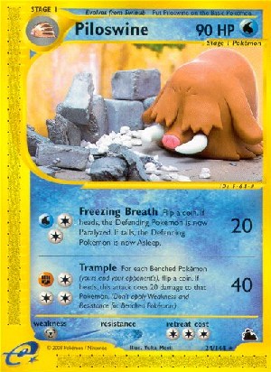 Kosten: Wirf eine Münze. Bei 'Kopf' ist das verteidigende Pokemon jetzt gelähmt. Bei 'Zahl' schläft das verteidigende Pokemon jetzt.  Schaden:
