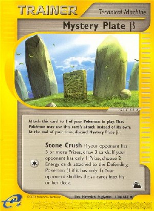 Beschreibung: Lege diese Karte an 1 deiner Pokemon im Spiel an. Dieses Pokemon kann den Angriff dieser Karte anstatt seines eigenen verwenden. Lege am Ende deines Zuges das Geheimnis-Schild ß auf deinen Ablagestapel.